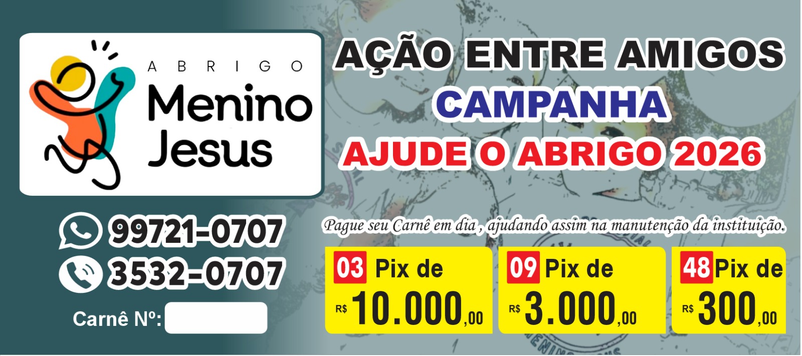 O Centro Social Menino Jesus, em Sinop, está realizando a “Ação Entre Amigos”, uma iniciativa comunitária para captar recursos que garantam infraestrutura, insumos e imprevistos no abrigo destinado a crianças (0–12 anos) e adolescentes (12–18 anos) em situação de vulnerabilidade.